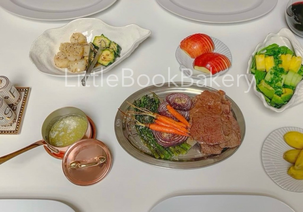 Steak with grilled vegetables and bread, an easy homemade dinner at home.