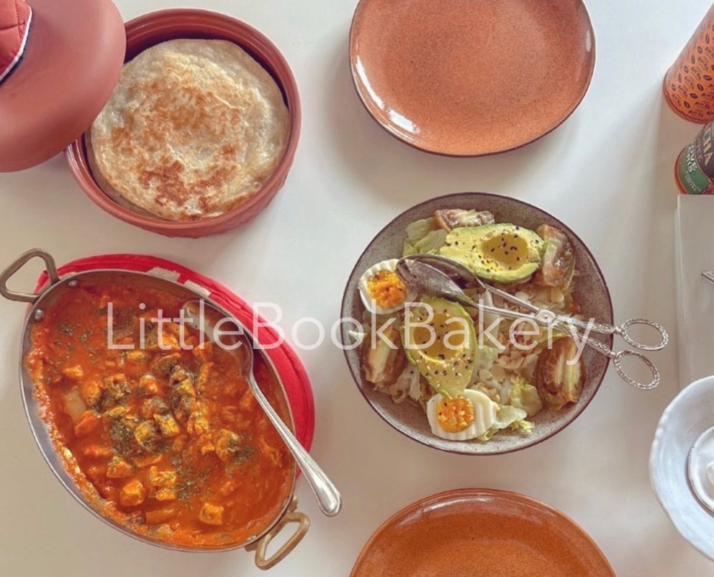 Butter chicken with naan and fresh salad, a simple homemade dinner at home.