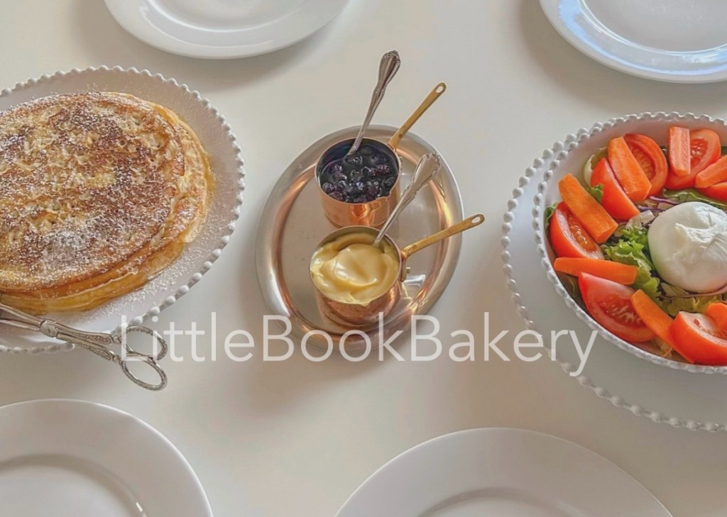 Crêpes with custard and fresh salad, a simple homemade brunch at home.
