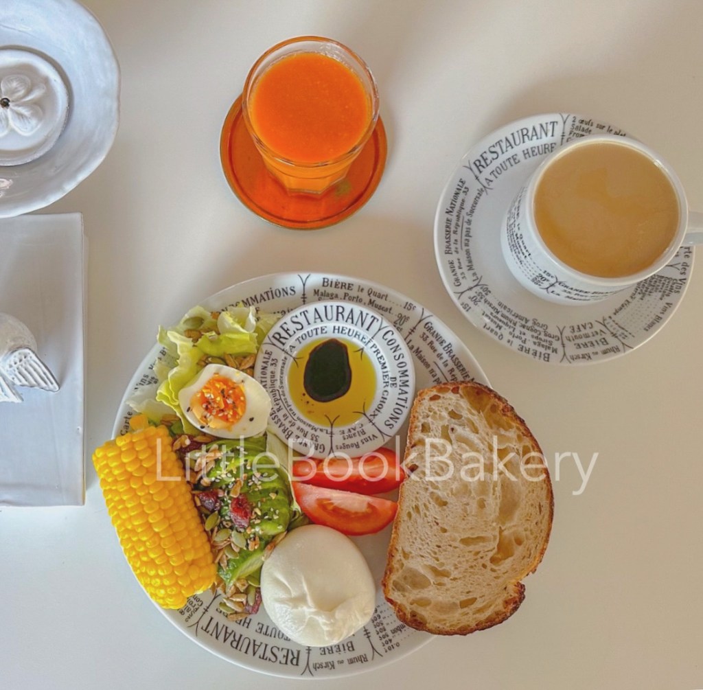 Salad with fresh vegetables, avocado, eggs, fresh cheese, nuts, sourdough bread, olive oil and balsamic vinegar, and fresh carrot juice.
