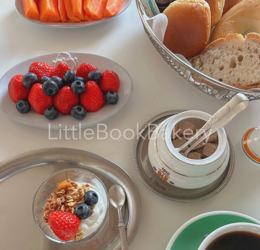 Greek yogurt with fresh fruit and bread, an easy homemade breakfast at home.